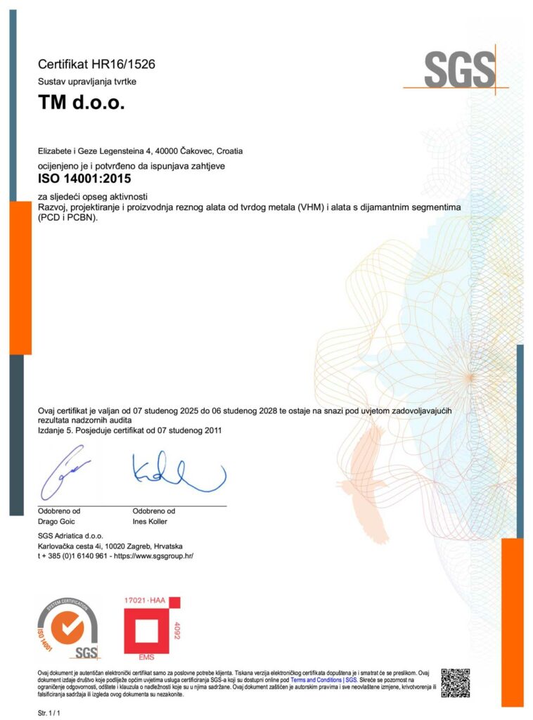 Od konca leta 2011 smo certificirani s strani certifikacijske hiše TÜV SÜD po sistemu upravljanja okolja ISO 14001 za razvoj, izdelavo in prodajo rezilnega orodja iz karbidne trdine (VHM) in orodja z diamantnimi segmenti (PCD in PCBN).